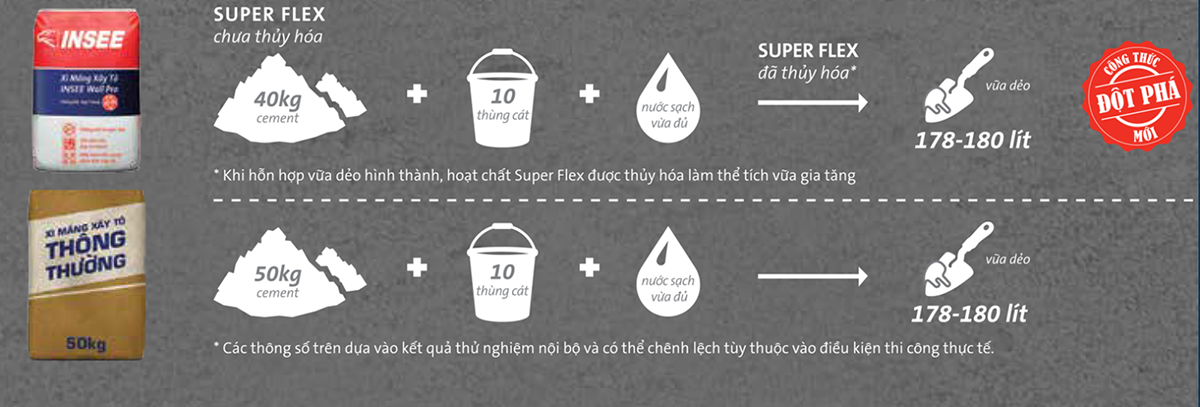 Trong công thức đột phá mới, hoạt chất Super Flex siêu nhỏ chen lẫn vào cát như một dạng cốt liệu mịn, tăng cường sự bôi trơn. Nhờ vậy, vữa dẻo mịn, bám dính và dễ dàng thi công hơn, mang đến lợi ích vượt trội cho công tác xây tô.
